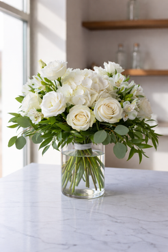 Choisissez votre budget idéal ! Laissez notre fleuriste créer un magnifique arrangement rustique de roses blanches cultivées localement en saison, capturant parfaitement l'influence du style champêtre du jardin. Profitez de la beauté des fleurs blanches du jardin.